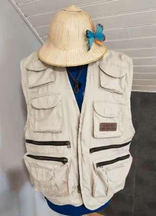 Conjunto de chaleco y sombrero de estilo colonial. - Chaleco con múltiples bolsillos y cremalleras. - Sombrero de paja con detalle de mariposa. - El chaleco es de color beige. - El sombrero es de color beige.