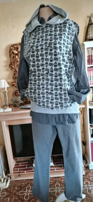 Descubre este original chaleco de hombre con capucha, confeccionado en suave y cómodo tejido de algodón, perfecto para el día a día. Su diseño destaca por un llamativo estampado integral de calaveras y billetes, que le confiere un aire rebelde y distintivo al más puro estilo rock and roll.Este chaleco es una prenda versátil: puedes llevarlo sobre una camisa de manga larga, como se aprecia en la imagen, para un look con más capas y personalidad, o combinarlo con una camiseta de manga corta para un estilo más casual y desenfadado. Incorpora un práctico bolsillo canguro en la parte delantera, añadiendo funcionalidad sin renunciar al..