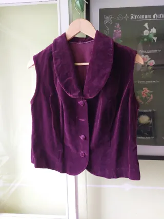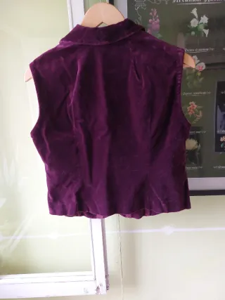 Chaleco de terciopelo en un vibrante tono morado. Perfecto para añadir un toque sofisticado a cualquier atuendo. - Material: Terciopelo suave. - Diseño sin mangas. - Cierre de botones al frente. - Cuello amplio y envolvente. - Pinzas para el pecho. - costura lateral con forma para las caderas. MEDIDAS EN PLANO, no envolventes sisa brazo 48 cm Cintura 46 cm Caderas 53 cm Largo de nuca costura inferior 54 cm De Hombro a hombro 40 cm