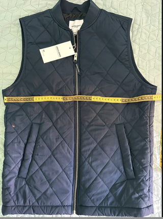 Chaleco acolchado de la marca Jack & Jones. Diseño moderno y versátil. - Acolchado con rombos. - Cuello redondo. - Cierre de cremallera frontal. - Dos bolsillos laterales. 100% Poliéster Nueva , con etiqueta pero tiene una mancha de un rotulador( mira fotos )