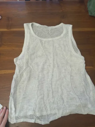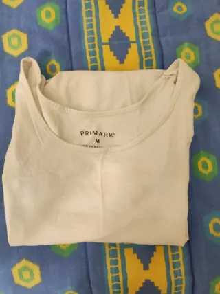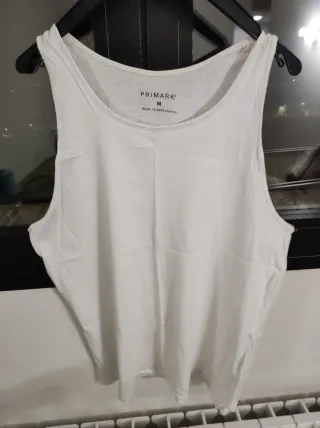 Camiseta básica de tirantes en color blanco. - Cuello redondo. - Tejido suave y cómodo. La prenda está en buen estado, el precio es para que puedas crear tu lote. 3 por 2 en ropa y bolsos! (te regalo el de menor precio)