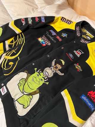 Chaqueta NASCAR con diseño de M&Ms y Shrek ultra mega rara con escasas unidades de producción. Reversible con un forro interior con estampado de camuflaje. Muy difícil de conseguir. La talla es como una 2XL. Escucho ofertas serias. En una lado tiene una mancha en la parte de la espalda cerca del sobaco pequeña y casi inapreciable como de lejía. Todo bordado una pasadísima de chaqueta una de mis favs en mi colección.