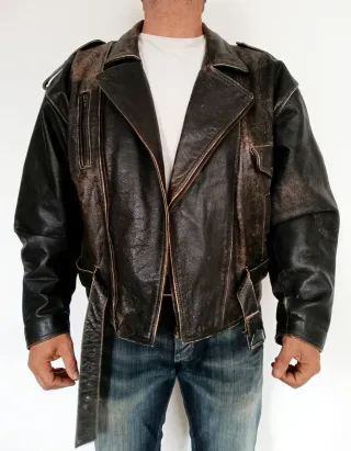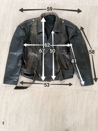 Más prendas de cuero en mi perfil. Bastante usada, pero el cuero está en buen estado. Efecto desgastado ya procedente de fábrica, acentuado por el uso. Falta el tirador de la cremallera y tiene una mancha de pintura verde en el hombro. Forro en buen estado. Cuero grueso vacuno de excelente calidad, ligeramente rígido y muy resistente. Talla XXL relativamente corta de talle. Ideal para usuarios de constitución fuerte y estatura media. El modelo mide 1,74 y pesa 82 kgs. Medidas indicadas en las fotos. Preguntar cualquier información sin compromiso.