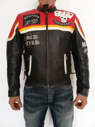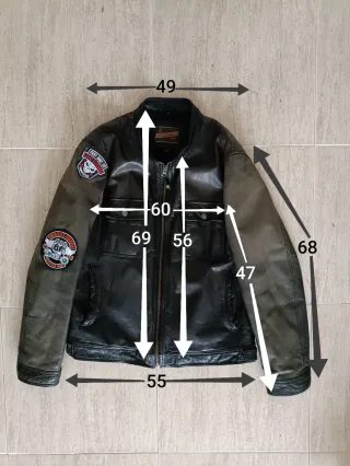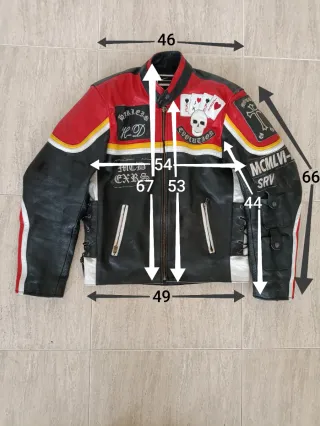 Más prendas de cuero en mi perfil. Biker café racer. Usada, pero en buen estado general. Dos emblemas bordados en la manga derecha que disimulan sendos desgarros. Espalda con impresión de plantilla. Forro de fieltro de lana grueso en buen estado, con dos o tres pequeños agujeros ya reparados en la zona inferior junto a la cintura. Cuero caprino de excelente calidad, muy resistente. Grosor medio-grueso. Textura brillante de grano pulido. Color negro carbón, con variaciones de tono ya procedentes de fábrica. La etiqueta indica talla XXL pero es más bien una XL. El modelo mide 1 74 y pesa 82 kgs. Medidas indicadas en las fotos.
