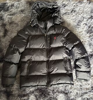 Giacca imbottita Polo Ralph Lauren. - Logo rosso sul petto. - Cappuccio integrato. - Chiusura con zip frontale. - Tasche laterali con zip. - Taglia L. - Unisex.