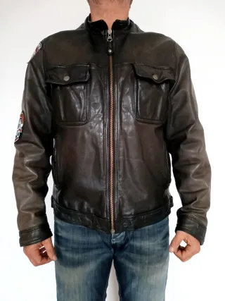 Más prendas de cuero en mi perfil. Bastante usada, pero en muy buen estado general, sin defectos ni desgaste, solamente señales de uso previo. Forro de algodón con algunos pequeños agujeros ya remendados en la zona del cuello y la cintura. Cuero vacuno de excelente calidad ligeramente rígido y muy resistente. Grosor medio m Textura de grano medio. Color marrón muy oscuro, casi negro. Talla M/L de corte oversized, queda holgada. Doble botonadura en los puños, trabillas ajustables en los costados.Mangas anchas, talle relativamente corto y estrecho. El modelo mide 1,74 y pesa 82 kgs. Medidas indicadas en las fotos. Preguntar cualquier