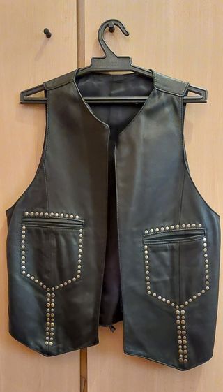 Chaleco de piel color negro, adornado con tachuelas, lleva dos bolsillos en la parte delantera. Medidas: 25 cm hombros, 42 cm pecho y 51 cm largo.