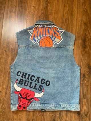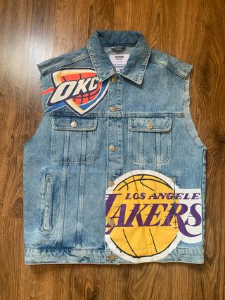 Chaleco vaquero con parches de la NBA. - Diseño sin mangas. - Cierre de botones metálicos. - Estampados de los Oklahoma City Thunder, New York Knicks, Chicago Bulls y Los Angeles Lakers. Perfecto estado. Disponible en talla S/M y L/XL.