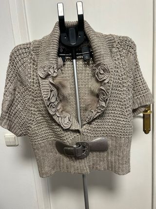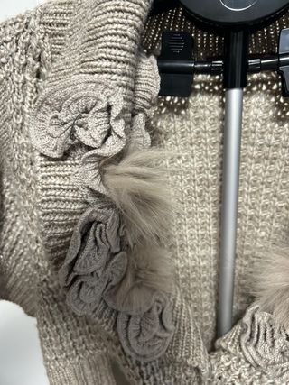 Chaqueta tipo chaleco de punto en color beige, talla XL. Presenta un diseño con cuello ancho y detalles florales. - Manga corta. - Cierre con cinturón metálico. - Adornos de pelo sintético. 25% lana. 75% acrílico. Ancho de hombros: 48 Alto: 58