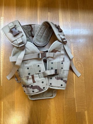 Chaleco militar con diseño de camuflaje desértico. - Tirantes ajustables con hebillas. - Múltiples correas y puntos de sujeción. - Acolchado en los hombros.