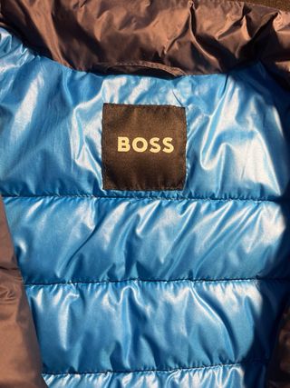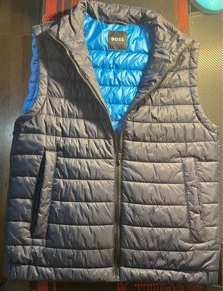 Chaleco acolchado de la marca Boss, con un diseño moderno y reversible. Talla M pequeña - Exterior en color azul marino - Interior en color azul brillante. - Cierre de cremallera frontal. - Bolsillos laterales.