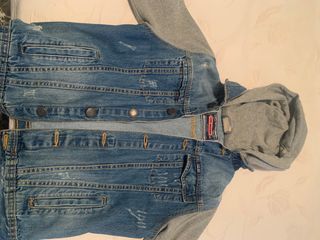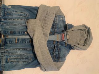 Chaqueta vaquera con mangas grises y capucha, ideal para entretiempo. Perfecta para completar cualquier look. - Talla 11-12 años. - Cierre de botones. - Bolsillos en el pecho y laterales.