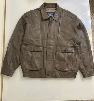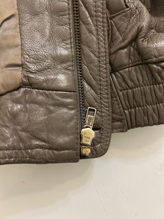 Cazadora de cuero marrón. El color no es homogéneo, tiene zonas más claras. Bolsillos. Bolsillo interior. Doble cuello. - Cierre de cremallera. - Hebillas decorativas en los hombros y cintura. - Cinturón ajustable en la cintura.