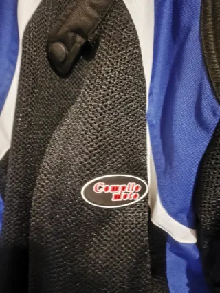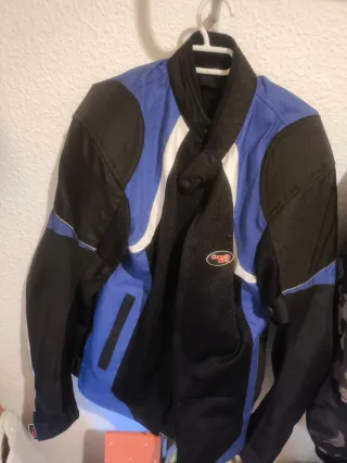 Chaqueta de motorista con diseño moderno y detalles en contraste. - Prácticamente Nueva - Con protecciónes - Paneles de malla para ventilación. - Cuello alto con cierre. - Bolsillos frontales.