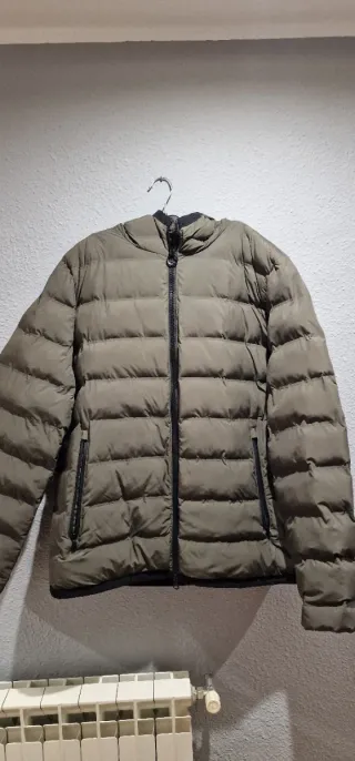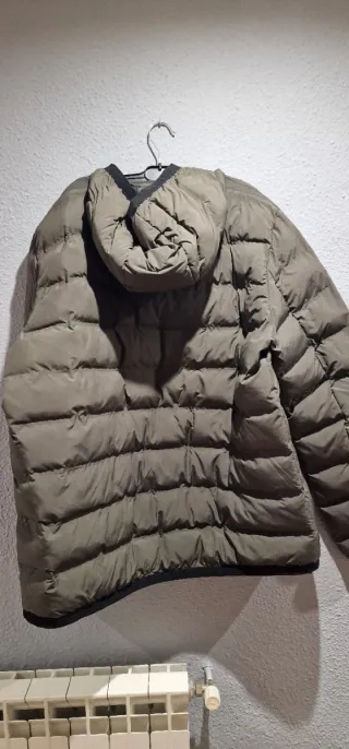 parka fina con capucha que se puede quitar , tiene un chaleco dentro fino pero abriga un poco