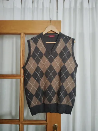 Chaleco de punto con diseño de rombos - Talla 5. Largo desde el cuello, 70 cm. Ancho de sisa a sisa, 56 cm. Lava muy bien y no le salen bolitas.
