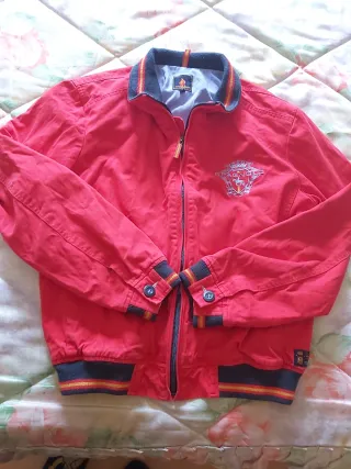 Chaqueta de la marca Spagnolo en color rojo. Presenta un diseño moderno y detalles distintivos. - Cuello con detalles de rayas. - Puños y cintura elásticos con rayas. - Cremallera frontal. - Escudo bordado en el pecho.