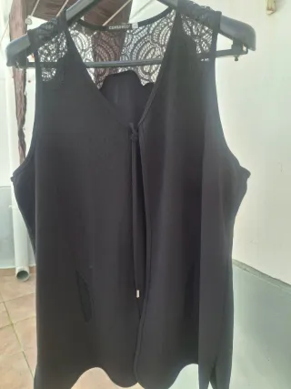 Elegante chaleco con detalles de encaje en la parte superior de la espalda y hombros y en los delanteros imitando bolsillos - Diseño sin mangas. - Cierre frontal con cordón. - Medidas: Hombro 36 cm; Sisa 70 cm; Largo 71 cm