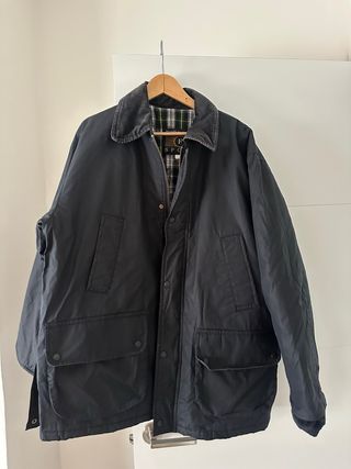 Chaqueta estilo Barbour en color azul marino. - Cuello de pana. - Forro interior a cuadros. - Bolsillos frontales con solapa.