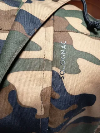 Chaqueton de invierno del Decatlón, marca Solonac, con estampado de camuflaje woodland e impermeable con capucha, dos bolsillos delanteros con cierre por velcro, un bolsillo interior en la solapa izquierda y otro bolsillo de gran tamaño en la parte trasera. - Marca Solonac del Decatlón. - Diseño con capucha. - Cierre frontal con cremallera y velcro. - 2 Bolsillos laterales delanteros. - 1 bolsillo interior con cremallera. - 1 bolsillo trasero de grandes dimensiones, cubriendo toda la zona de los riñones y cierre por velcro. Solo se hacen envíos a través de la aplicación de Wallapop y no se aceptan ofertas a la baja ni rebajas.