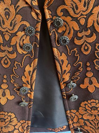 Chaleco de fallero con un diseño elegante y llamativo. - Estampado de hojas doradas sobre fondo granate. - Cuello mao. - Cierre de botones. - Dos bolsillos interiores. Nuevo sin usar