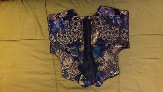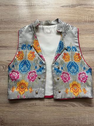 Chaleco fallero con un bonito estampado floral. - Talla 5 años. - Diseño con detalles dorados y azules. - Tejido con acabado brillante.