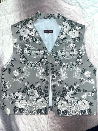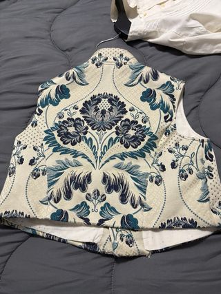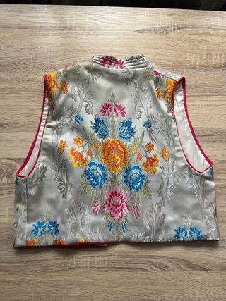 Chaleco de vestir con un diseño tradicional. - Estampado floral en tonos rojos y blancos. - Cuello mao. - Cierre cruzado con botones. - Bolsillos delanteros. Usado sólo en una ocasión.