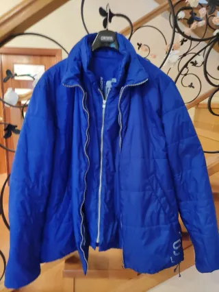 Chaqueta de plumas con relleno sintético. Se puede llevar con o sin chaleco. Capucha escondida. Está en buen estado excepto un logo algo desvaído ( última foto). Talla XL