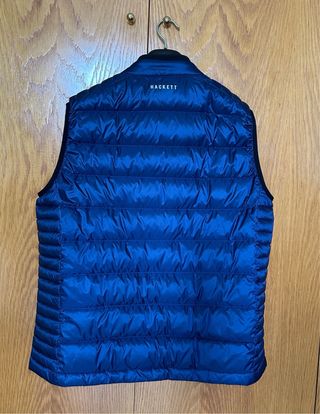 Chaleco de plumas acolchado y resistente al agua de la marca Hackett en color azul y talla XL. Presenta un diseño moderno y ligero con un color azul marino súper exclusivo que en función de como le de la luz es más brillante metalizado o más mate. No encontraras un chaleco azul más bonito y elegante que este modelo. - Cierre de cremallera frontal. - Cuello redondo. - Dos bolsillos laterales con cremallera. - Logo de Aston Martin Racing en el pecho. Estado impecable, ningún defecto.