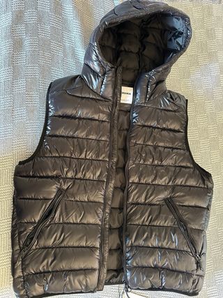 Chaleco acolchado con capucha, ideal para añadir una capa extra de abrigo. Se ha usado pocas veces. - Cierre de cremallera frontal. - Dos bolsillos laterales con cremallera. - Puños y bajo elásticos.
