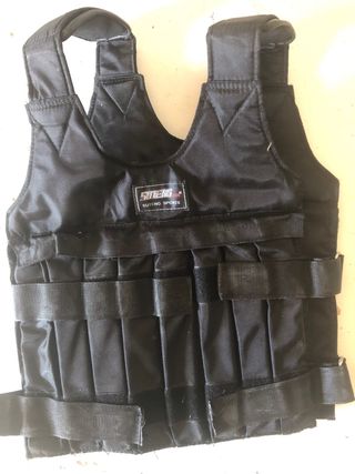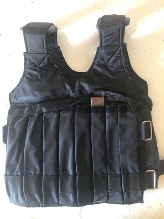 Chaleco de entrenamiento diseñado para añadir resistencia a tus rutinas. - Fabricado en material resistente. - Diseño ajustable para mayor comodidad. - Compartimentos para añadir o quitar peso. poco uso. viene con pesas de hierro