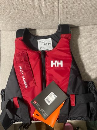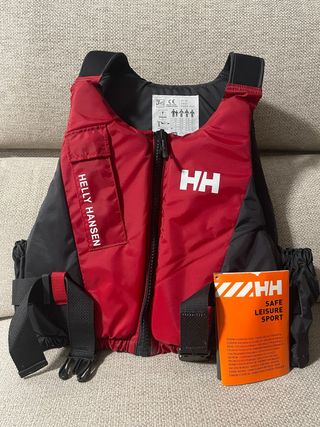 Chaleco salvavidas de la marca Helly Hansen, ideal para actividades acuáticas. - Color rojo y negro. - Cierre de cremallera frontal. - Correas ajustables con hebillas.