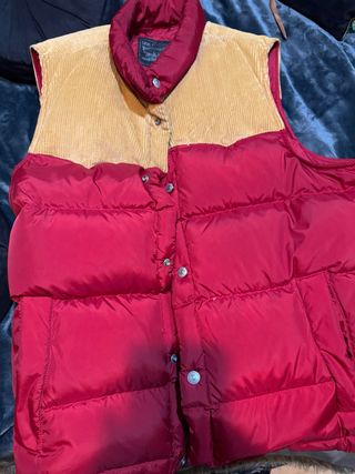 Chaleco acolchado de Levi's con paneles de pana. - Parte superior en pana color beige. - Parte inferior y cuello en material acolchado color rojo. - Cierre de botones. - Diseño sin mangas.el otro chaleco es con tela vaquera,sin de plumas,sin apenas uso,No rebajo nada,estos chalecos cuestan 140€ cada uno,el precio es por cada uno