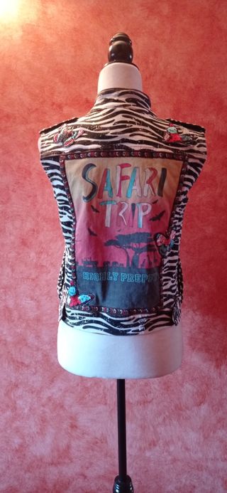 Chaleco con muchos detalles. 2 bolsillos grandes en el frente y 2 laterales. Tela vaquera. En la etiqueta pone XS, pero es algo más. De axila axila 44 cm Largo 50 cm.