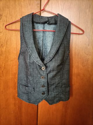 Chaleco entallado de tejido vaquero, color gris o negro descolorido, tejido blando, con su presilla para entallar, además de las costuras que de por sí ajustan al cuerpo .Hace un poco cuello Hunter, la verdad que queda mucho mejor puesto, es para una 36-38 Tiene muy pocas puestas ;tengo más chalecos en mi perfil.