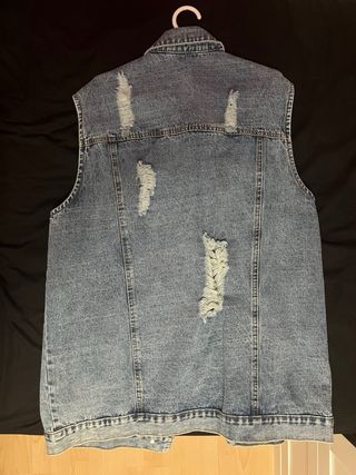 Chaleco vaquero con un estilo moderno y desgastado. Medidas: Largo 75cm - Pecho 55cm - Detalles rotos y desgastados. - Cierre de botones.