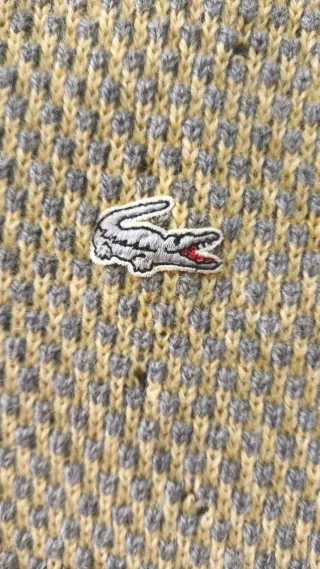 Chaleco vintage Lacoste (etiqueta Chemise Lacoste, Made in France). Tejido 100% lana virgen (etiqueta “pure laine vierge”). Color mezcla arena/gris — tejido gordito, ideal para capas. Medidas aproximadas: 42cm de hombros / 68cm de largo/50cm de axilas. Etiqueta talla 4 (equivale aprox. a M actual). Apta también para mujer como oversize. Revisa medidas en cm. Estado: usado — presenta pequeños signos de uso y un par de puntitos con desgaste (8)-(ver fotos en detalle). El cocodrilo está cosido (ver foto). La prenda conserva su etiqueta original. Presenta 8 pequeños puntos abiertos en la costura (agujeritos), visibles en las fotos