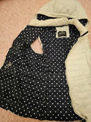 Chaleco acolchado con capucha y forro interior de lunares. - Cierre de cremallera frontal. - Dos bolsillos laterales con cremallera. - Diseño acolchado horizontal. - Forro interior con estampado de lunares.