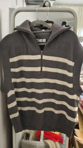 Chaleco de punto con cuello alto y cremallera. Talla correcta, ligeramente oversize - Diseño de rayas horizontales. - Tejido de punto acanalado. - Sin mangas. Largo 57cm Ancho 44cm