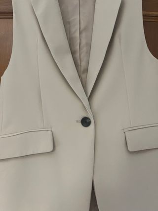 Chaleco medio color beige. Cuello solapa y bolsillos delanteros con tapeta. Cierre frontal con 1 boton. Talla M ( talla un poco grande). En buen estado . Muy poco usado