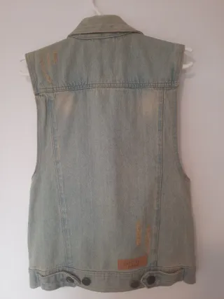 Chaleco vaquero desgastado con un estilo moderno. - Diseño sin mangas. - Cierre de botones. - Dos bolsillos en el pecho. - Detalle de rotos y deshilachados.