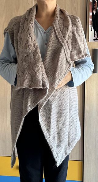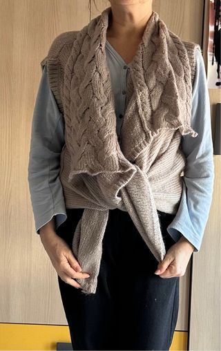 Cálido chaleco con cuello y bordes de ochitos con posibilidad de llevarlo suelto o anudado por lo que vale para varias tallas
