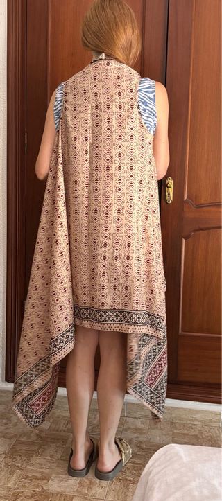 Preciosa chaquetilla étnica de poliester/seda, perfecta para darle un toque boho a tu look. Es de talla única y tiene un diseño precioso con detalles en rojo sobre fondo beige. - Diseño ligero y fluido. - Caída asimétrica. - Ideal para combinar con vestidos o camisetas.