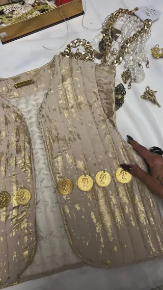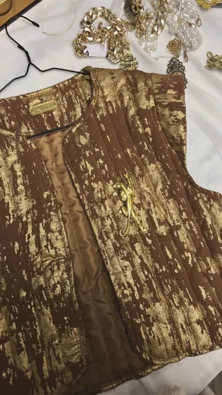 Elegante chaleco con un diseño único. Color marrón 1 Disponible y color Beige 2 Disponibles. - Acabado en tejido beige con detalles dorados. - Adornado con monedas decorativas. - Cierre frontal.