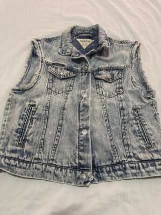 Chaleco vaquero con un diseño desgastado y moderno. - Corte sin mangas. - Acabado con efecto lavado a la piedra. - Cierre de botones metálicos. - Bolsillos en el pecho con solapa. - Bolsilso interiores