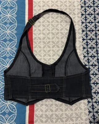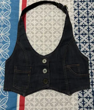 Chaleco vaquero de corte moderno para chica. - Diseño tipo halter. - Cierre de botones. - Dos bolsillos frontales. - Detalle de pespuntes. Se entrega en Badalona, los envíos los hago a través de wallapop por la agencia de Correos.