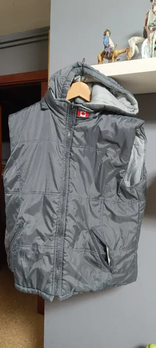 Chaleco Canadian Peak en color gris. La talla es XL, aunque el vendedor desconoce la equivalencia exacta. - Diseño acolchado. - Capucha. - Cierre de cremallera.