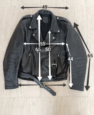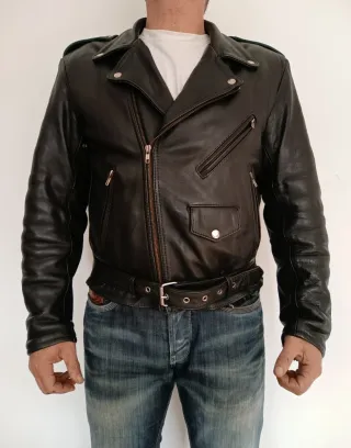 Más prendas de cuero en mi perfil. Cazadora motera modelo Perfecto, o chamarra de uñas. Usada, pero en muy buen estado general, sin defectos, manchas ni desgaste. Forro acolchado un poco usado, pero sin roturas. Cuero vacuno de excelente calidad, flexible y muy resistente. Grosor medio-grueso. Textura de grano medio. Color negro intenso y brillante. Talla entre la L y la M, un poco corta de talle. El modelo mide 1 74 y pesa 82 kgs. Medidas indicadas en las fotos. Preguntar cualquier información sin compromiso.