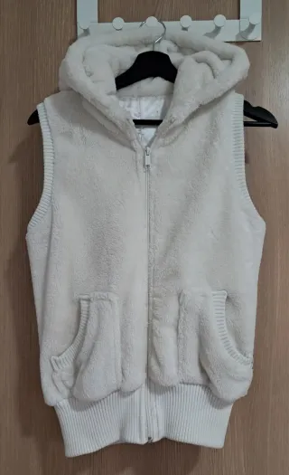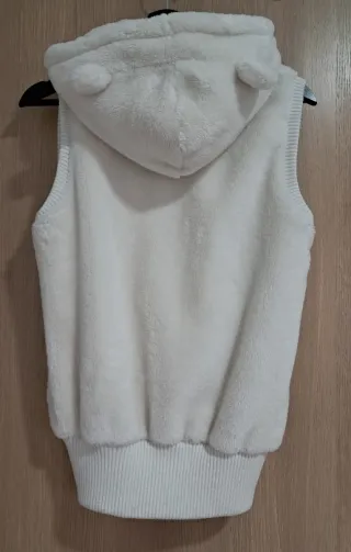 Chaleco blanco de cremallera con capucha y bolsillos delanteros. Suave y calentito. Puños y bajo elásticos.