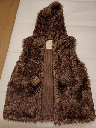 Chaleco de pelo sintético con capucha y detalles de punto. - Cierre con cordones. - Dos pompones decorativos en la parte delantera.